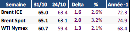 Les prévisions de Bloomberg du 31 octobre restent prudentes, anticipant un prix du Brent de 63 $/b au quatrième trimestre 2025, puis de 61,5 $/b (+ 0,5 $/b) au premier trimestre 2026. Le mois d'octobre s'achève sur une baisse mensuelle d'environ 5 % pour le Brent et le WTI, à 64,0 et 60,1 $/b en moyenne. Depuis le début de l'année, le Brent accuse un recul de 18 %, confirmant la tendance de fond d'un marché surabondant, mais vulnérable aux soubresauts géopolitiques et aux fluctuations de la demande.