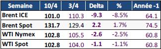 Sur la semaine, le prix spot moyen du Brent s’est établi à 131,7 $/b, en hausse de 1,7 %, tandis que le WTI était en baisse de 1,1% à 102.8 $/b. Sur les marchés à terme, le Brent à livraison en juin a baissé de 8,5 %, pour atteindre 101 $/b. Le consensus Bloomberg du 10 avril est stable avec un prix moyen du Brent pour le 2T, à 77,5 $/b et pour le 3T, à 75 $/b. Dans son scénario le plus haut, le consensus anticipe désormais un Brent à 125 $/b au deuxième trimestre et à 100 $/b au troisième trimestre.