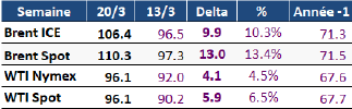En moyenne hebdomadaire, les prix du pétrole ont nettement progressé. Le prix spot du Brent s’est établi à 97,3 $/b, en hausse de 14 %, tandis que celui du WTI a atteint 90,2 $/b, en progression de 15 %. Sur les marchés à terme, le contrat Brent pour livraison en mai a augmenté de 15 %, à 96,5 $/b, et le WTI de 17 %, à 92 $/b.