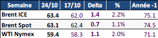 Les cours du pétrole ont nettement reculé la semaine dernière, effaçant les gains enregistrés en début de période, sur fond d’incertitudes économiques et de regain de tensions commerciales entre la Chine et les États-Unis. Après un rebond initial, porté par la décision de l'Opep+ de contenir l'augmentation de production à 137 kb/j pour novembre, le Brent a atteint un pic temporaire proche de 67 $/b mercredi. Mais la tendance s'est rapidement inversée en fin de semaine. L’annonce par Pékin de nouvelles restrictions sur les exportations de terres rares, suivie des menaces de Donald Trump d'imposer des droits de douane de 100 % sur les produits chinois, a provoqué une vague de ventes sur l'ensemble des marchés des matières premières. Parallèlement, l'augmentation des stocks pétroliers aux États-Unis, la publication du rapport mensuel de l'EIA qui anticipe un excédent structurel de l'offre jusqu'en 2026, ainsi que la baisse des importations chinoises de brut, ont renforcé la pression à la baisse sur les cours.