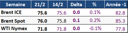 En moyenne hebdomadaire, le prix du Brent ICE (contrat à terme à un mois de Londres) a augmenté de 2,6 $/b (+3,3 %) à 82,5 $/b, tandis que le WTI a gagné 3,1 $/b (+4,2 %) à 77,7 $/b. Le consensus des économistes interrogés par Bloomberg le 16 février est stable par rapport à la semaine dernière, avec un prix du Brent pour le premier trimestre à 82,5 $/b et 83,0 $/b pour le deuxième trimestre (Fig. 3).