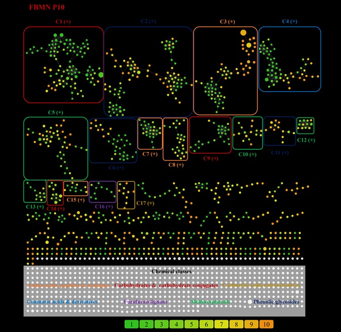 Une diversité chimique considérable a été mise en évidence comme l’illustre la Figure 1 sur un hydrolysat. La visualisation proposée permet de présenter de manière synthétique : la complexité de l’échantillon (un point représentant un composé détecté) et les familles chimiques principales. La démarche facilite en outre l’identification par propagation de l’information, car l’identification d’un seul composé par cluster permet de faire des propositions pour les points du même cluster (appartenant à une même famille chimique) et elle accroît le niveau de confiance des regroupements par le biais d’un jeu de couleur.