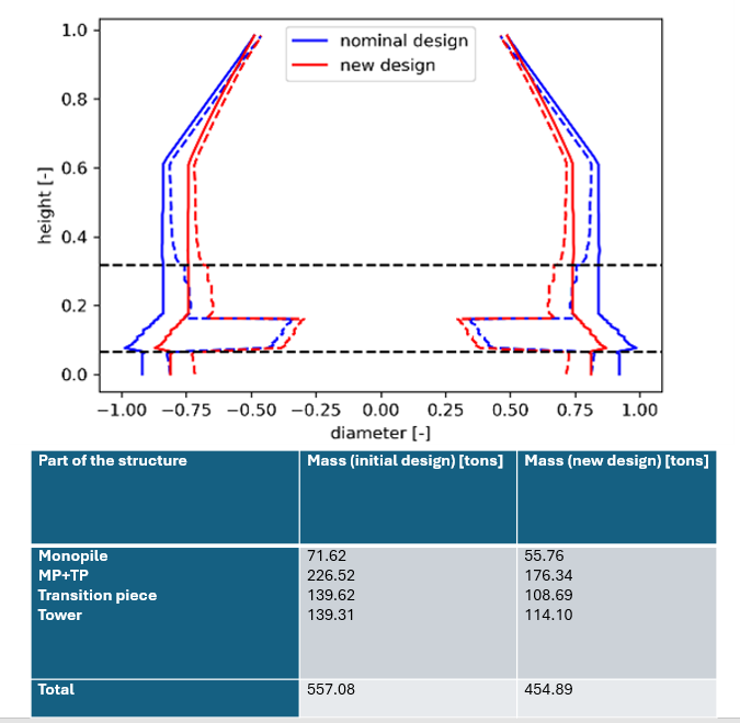 - sur le plan de la conception : l’optimisation pour un cas d’étude d’une tour et de sa fondation monopieu, conduisant à une réduction de sa masse de 20% (figure 1) [4] ;